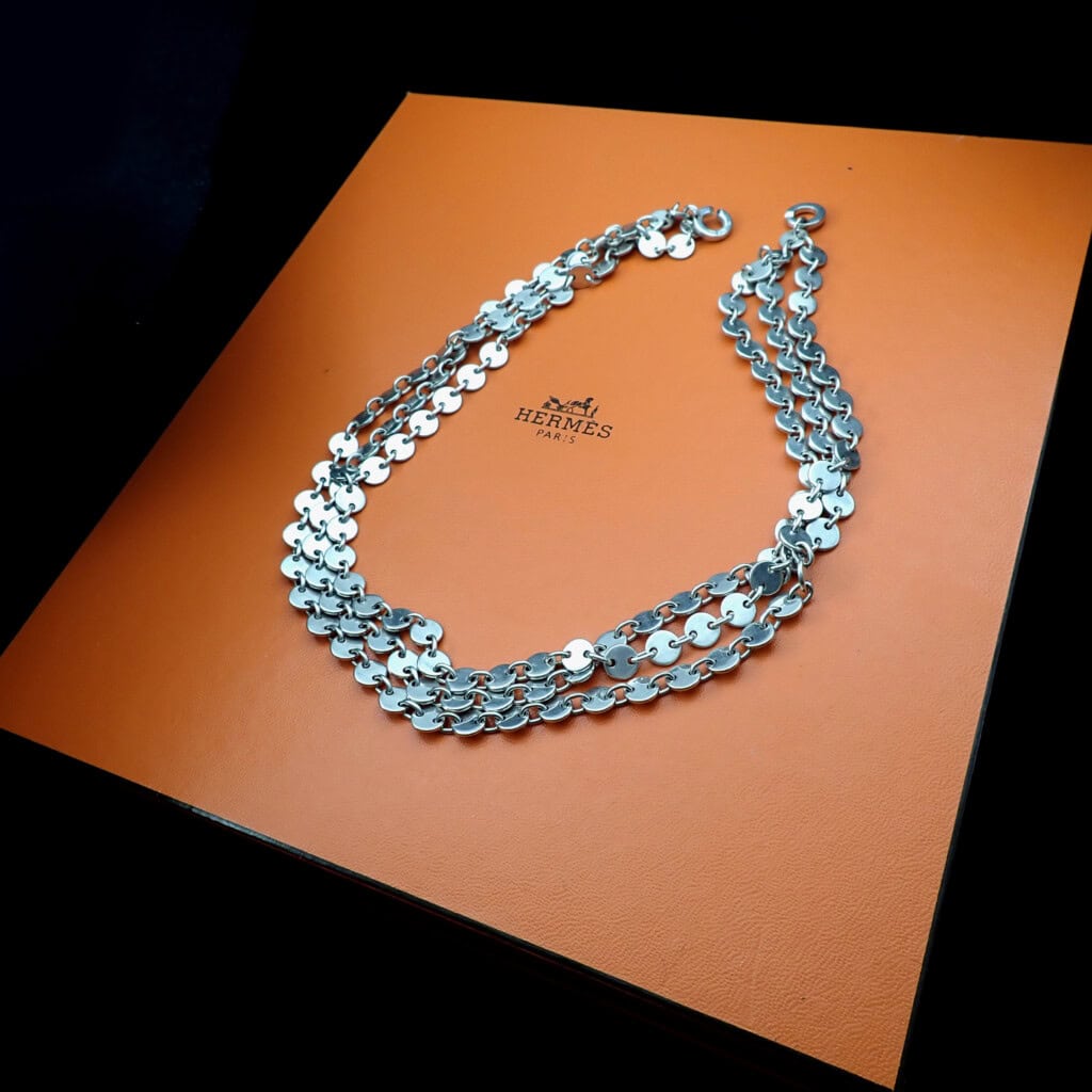 エルメスの「コンフェッティ」3連ネックレスは、上質なシルバーが繊細に連なり、胸元に軽やかな動きを添えるエレガントな一品です。