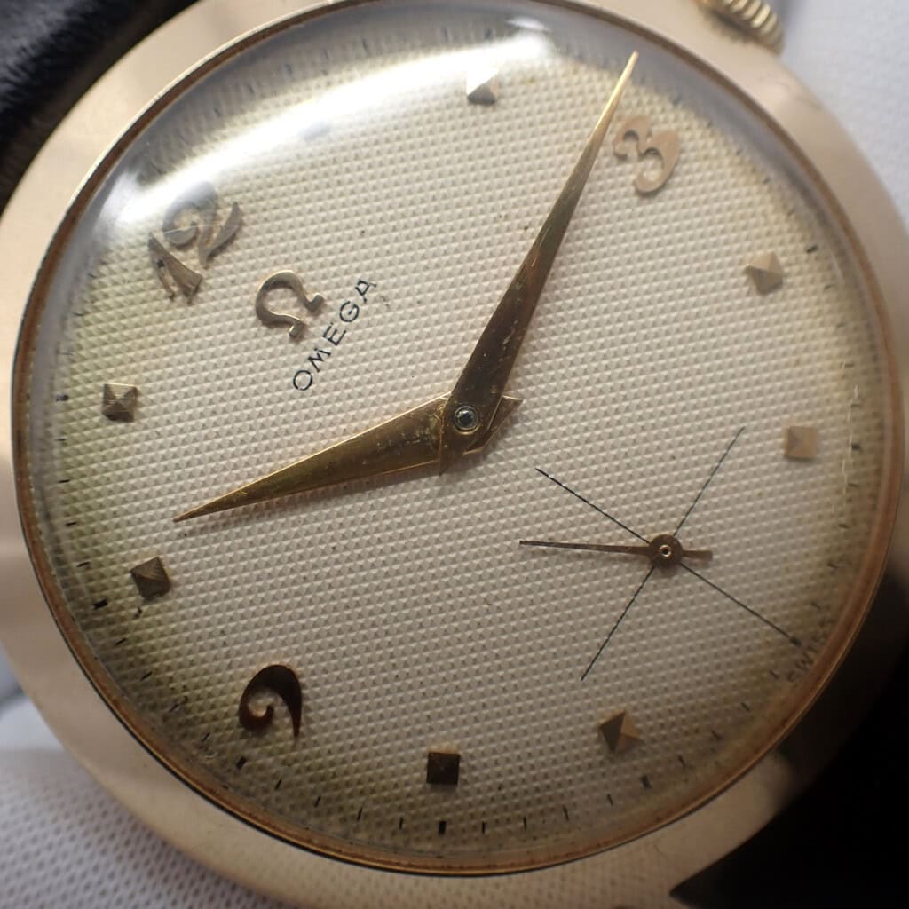 また、このムーブメントにはインカブロック式耐震装置が搭載されており、耐衝撃性にも優れています。さらに、テンプ受けにはオメガのスイスメーカーコード「OXG」が刻印されており、オメガの技術力と信頼性を物語っています。裏蓋には「14K GOLD D&A」の刻印D&Aは当時のアメリカの時計ケース製造会社です。この時計は、当時の高度な技術を象徴する貴重な逸品です。