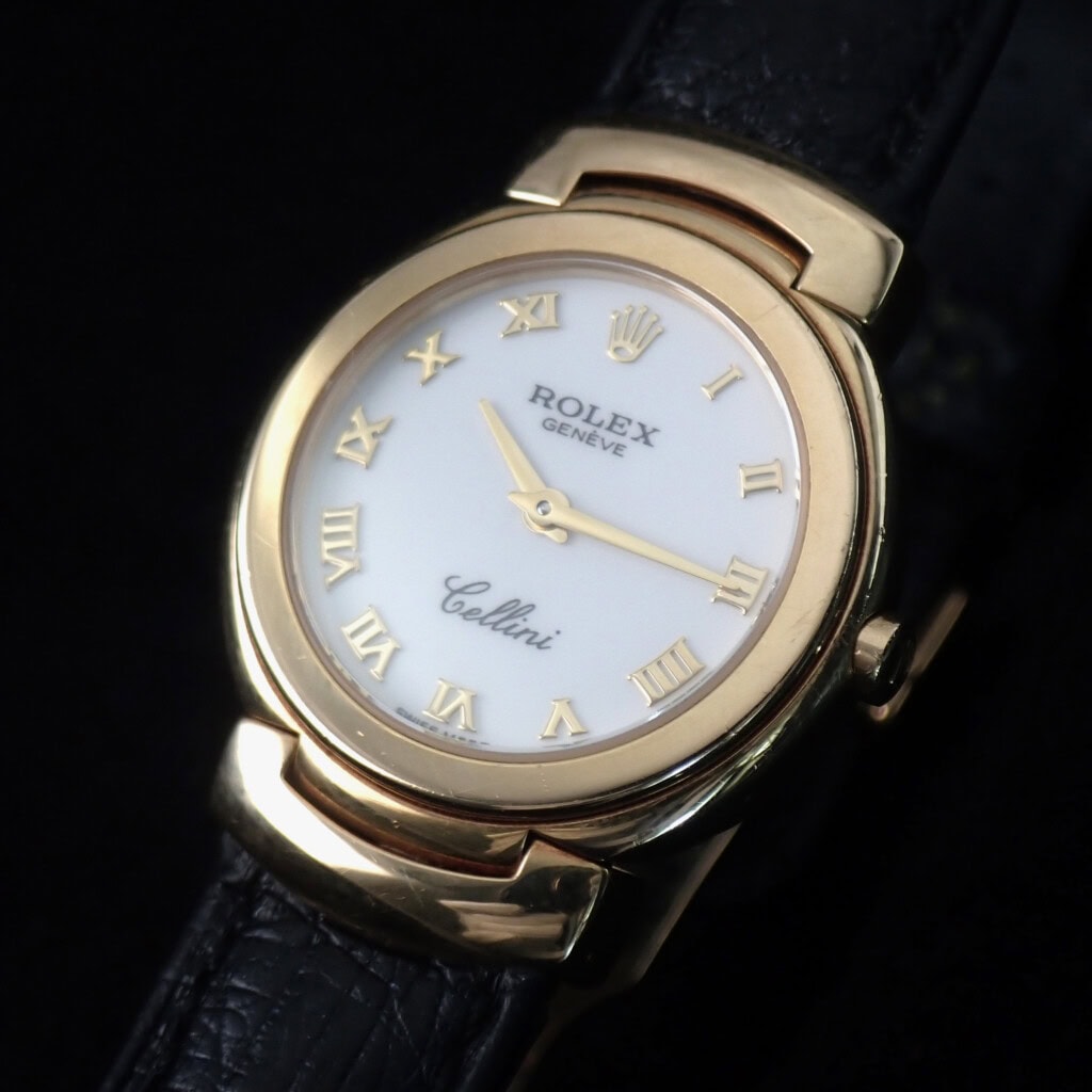 26 mmの小振りなケースに、18Kイエローゴールドの輝きを凝縮したチェリーニ Ref. 6621。現行モデルでは味わえないクラシカルなサイズ感と、シンプルな2針フェイスが腕元に上質なアクセントを添えます。ムーブメントはロレックス製クォーツ Cal. 6620。驚くほどスリムな約6 mm厚のケースは装着感も軽快で、ビジネスからフォーマルまで幅広いシーンで活躍します。